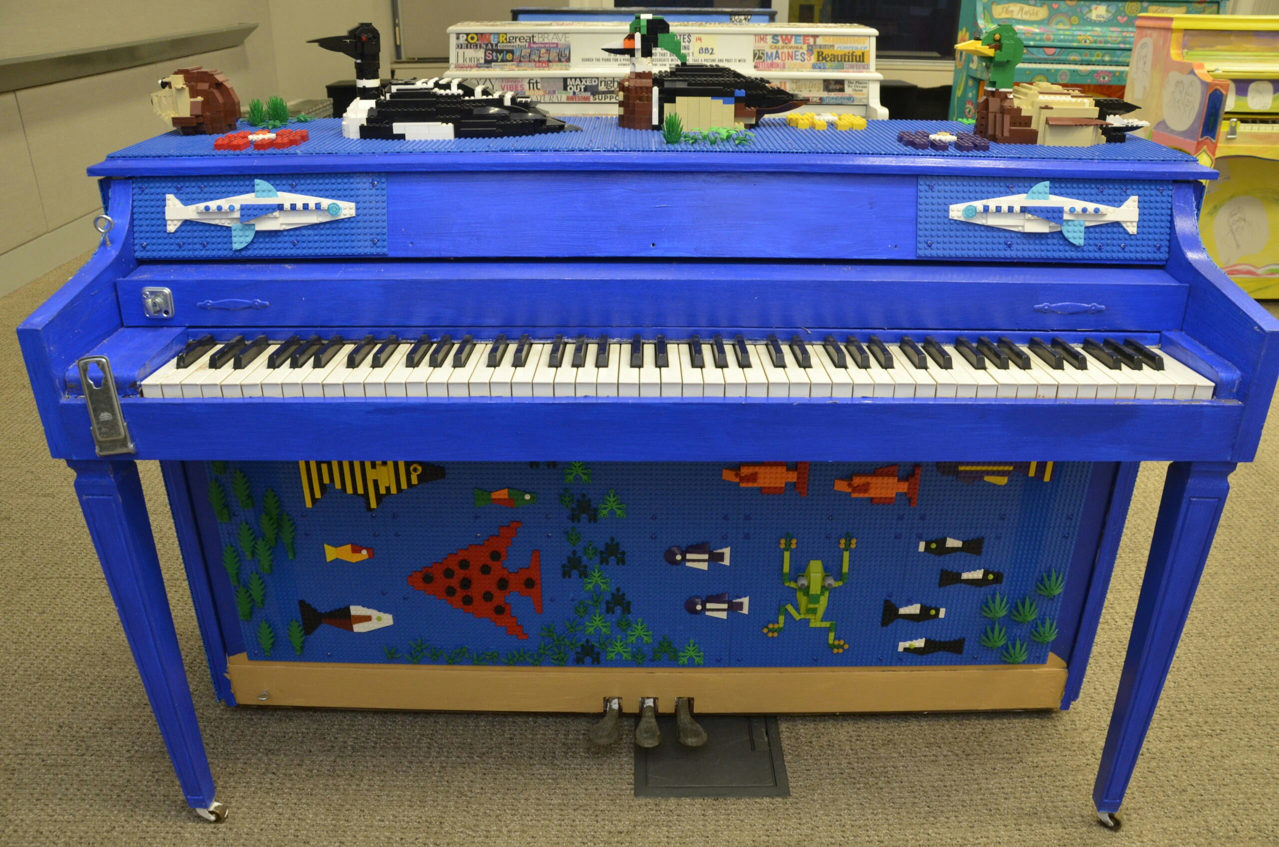 Artist Statement: This year I chose to use Legos as a mosaic medium. Legos are fairly light; the colors are bright; they are versatile, attract children (and adults), and much like the buttons, they have nostalgic quality as well. I chose a nature concept, because there are all sorts of creatures to be represented: fish, amphibians, birds. I hope that this piano will be a oasis in the city.