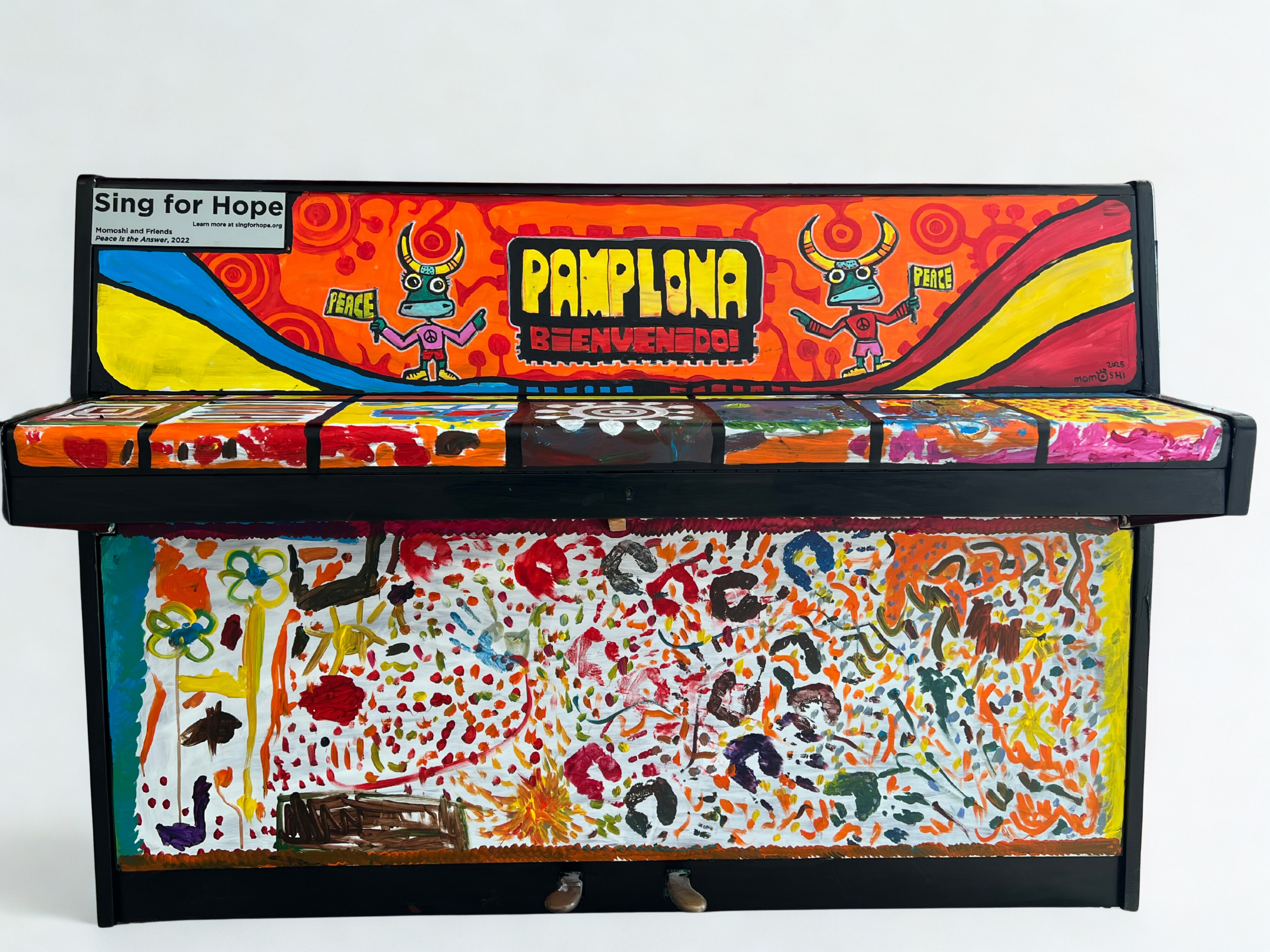 Artist Statement: This Sing for Hope Piano, Pamplona Bienvenido, is a celebration of unity, color, and resilience, created together with Ukrainian refugee children. Its design bridges two worlds: a Ukrainian flag that flows into the Spanish one, symbolizing hope finding a new home. Two playful bulls wave peace flags above the city’s name — a joyful tribute to Pamplona’s spirit of welcome and courage. The children filled the lower panels with vibrant handprints and spontaneous bursts of paint, transforming their emotions into color. Every mark reflects laughter, curiosity, and the freedom of expression. This Sing for Hope Piano invites everyone to play, connect, and imagine a future shaped by empathy. In its melodies and colors, we find what unites us: the shared rhythm of peace, belonging, and joy.