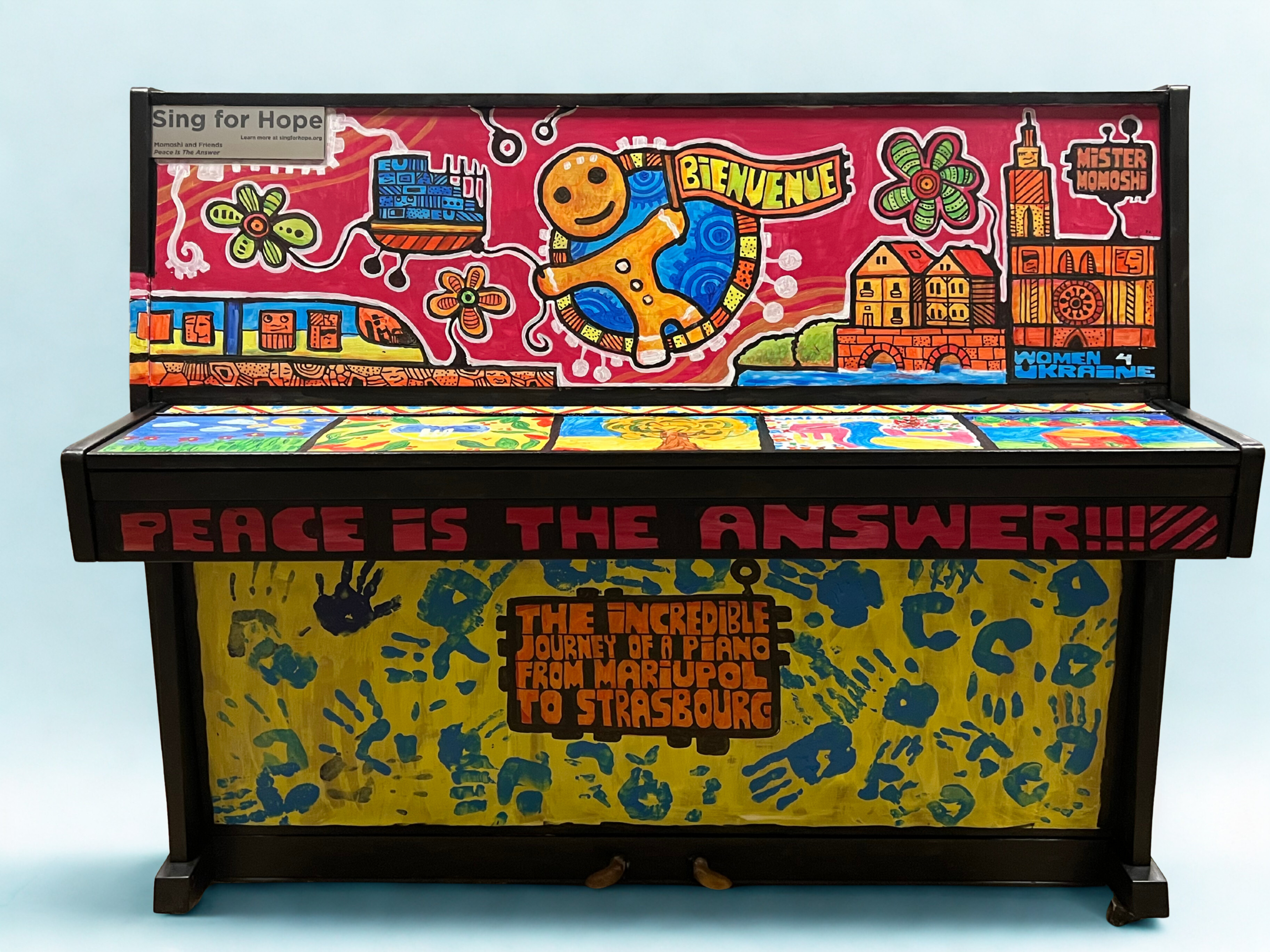 Artist Statement: This Sing for Hope Piano Peace Is The Answer- Strasbourg, Peace Is the Answer, tells the extraordinary story of a piano that traveled from war-torn Mariupol to the heart of Europe. Rescued amid devastation, it became a messenger of hope, finding its new voice in Strasbourg — a city of peace, democracy, and connection. Together with Ukrainian refugee children, we painted symbols of resilience and unity: the Strasbourg Cathedral, the European Parliament, the city’s riverside houses, and a tram in the colors of Ukraine. Each brushstroke honors the Sing for Hope Piano’s journey from survival to song. Across the front, the words “Peace is the Answer” remind us that art can transcend borders and pain. This piano invites everyone to play, to listen, and to believe that through creativity and compassion, harmony is always possible.